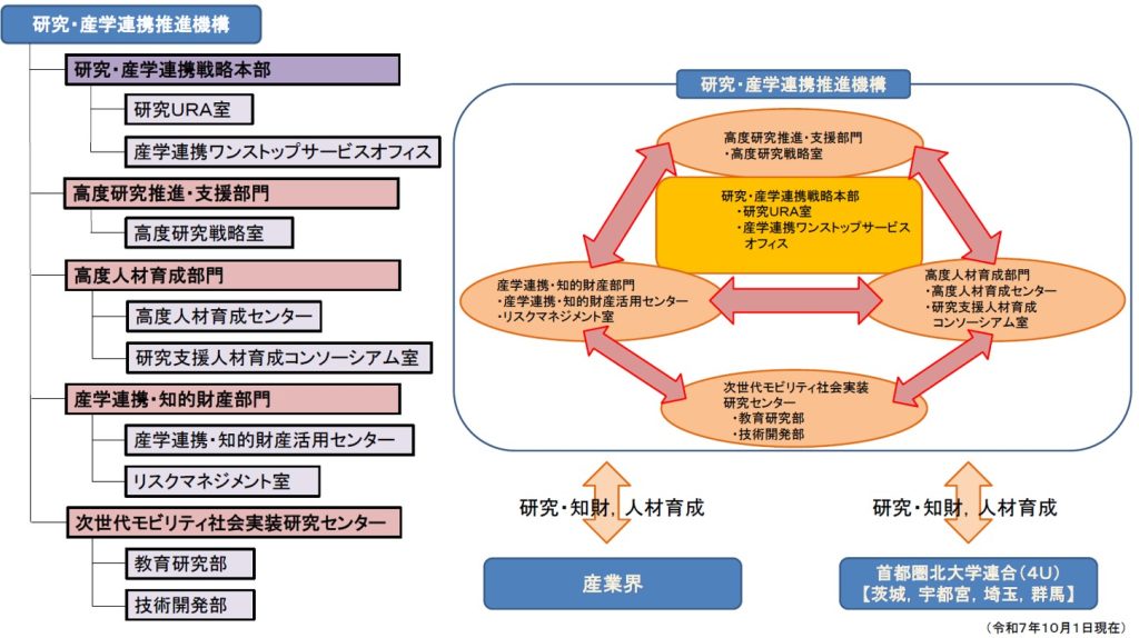 本機構は、研究・産学連携戦略本部、高度研究推進・支援部門、高度人材育成部門、産学連携・知的財産部門、次世代モビリティ社会実装研究センターからなり、優れた研究成果を生み出すための体制を強化し、知的財産の管理・運用等を円滑に行い、本学における学術研究の一層の高度化とその成果を広く社会に還元することを目的としています。