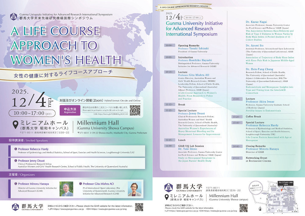 The Gunma University Initiative for Advanced Research (GIAR) will host an international symposium titled “A Life Course Approach to Women’s Health” on December 4th 2025.