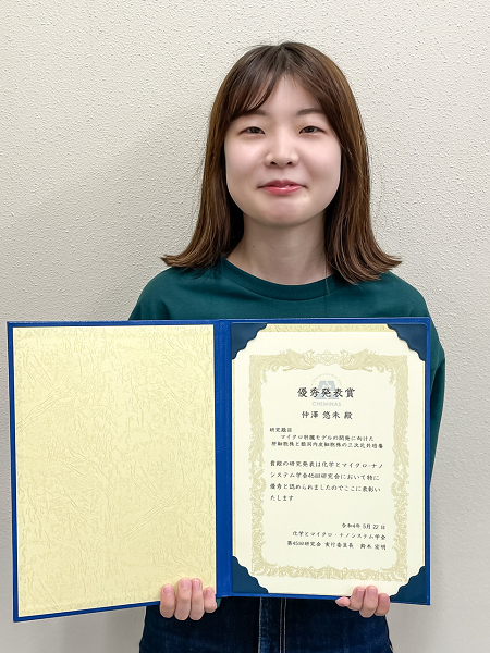 大学院理工学府 物質・生命理工学教育プログラム 博士前期課程1年の仲澤悠未さんが、化学とマイクロ・ナノシステム学会 第45回研究会にて優秀発表賞を受賞しました。