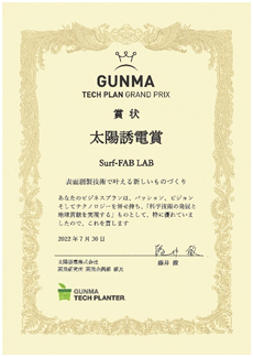2022年7月30日にGメッセ群馬で開催された第2回ぐんまテックプラングランプリにおいて、理工学府知能機械創製部門/機能性界面・表面創製研究室(小山真司准教授)からなるチーム「Surf-FAB LAB(サーフファブラボ)」が企業「太陽誘電」賞を受賞しました。
