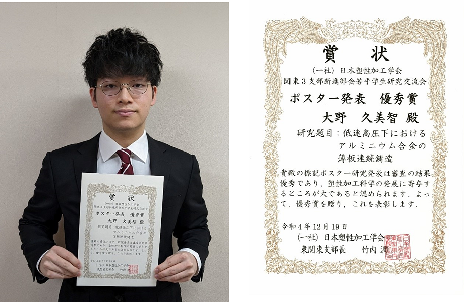 2022年12月19日にオンラインで開催された一般社団法人日本塑性加工学会関東3支部新進部会若手学生研究交流会において、知能機械創製理工学教育プログラム博士前期課程2年の大野久美智さんが、ポスター発表優秀賞を受賞しました。大野さんは、低速高圧下におけるアルミニウム合金の薄板連続鋳造の研究を行いました。
