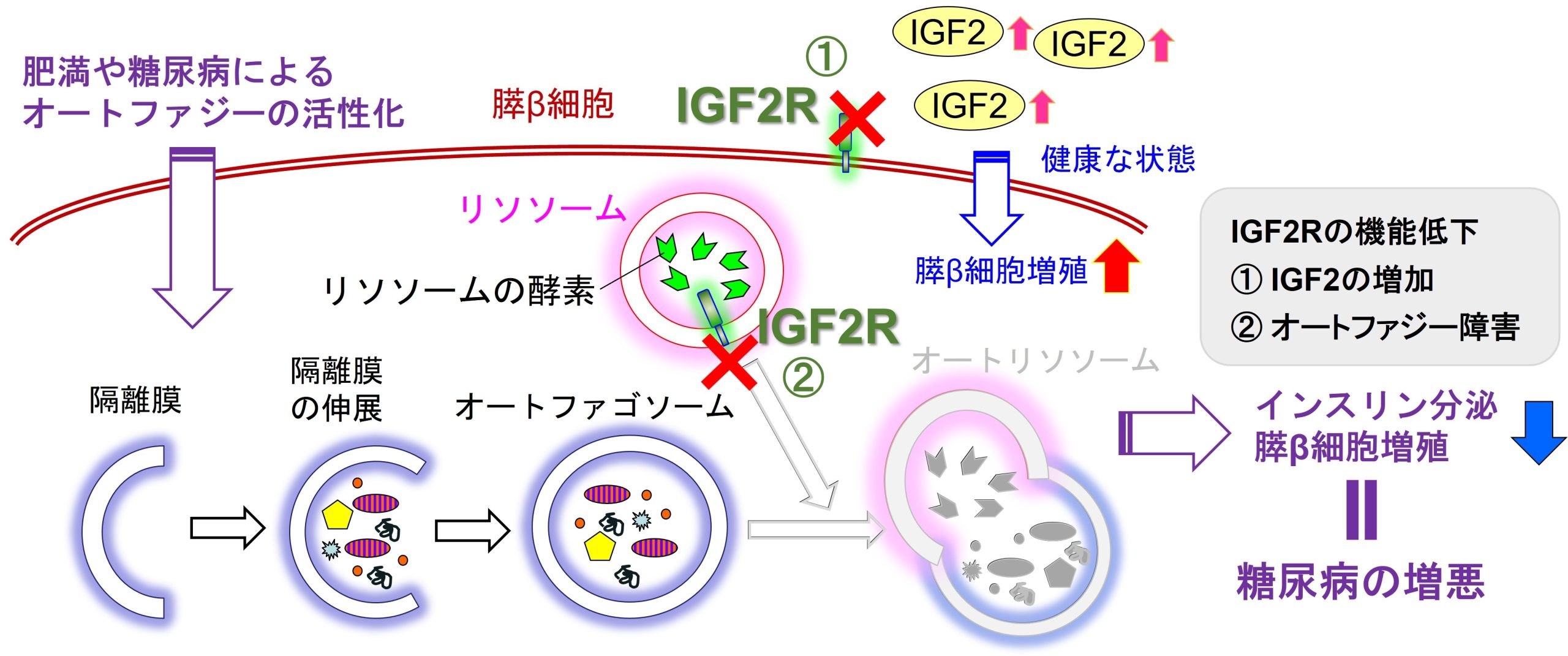 生体調節研究所代謝疾患医科学分野の白川純教授らの研究グループは、インスリンを作り出す膵β(ベータ)細胞における「IGF2R(インスリン様成長因子2受容体)」という受容体の新たな役割を発見しました。IGF2Rは成長因子IGF2を分解する一方で、リソソームへ酵素を輸送する働きを持ちます。今回、IGF2Rを欠損するとIGF2の蓄積で一時的に増殖は促進されますが、インスリン分泌は低下し、肥満や糖尿病状態ではむしろ膵β細胞数が減少することが明らかになりました。その背景にはオートファジーという細胞のリサイクル機構の低下が確認されました。また糖尿病ドナー由来膵島ではIGF2R mRNAのm6Aメチル化が低下しており、IGF2Rの発現異常が病態に関与する可能性が示唆されました。これらの結果から、IGF2Rは、細胞外IGF2量の調節やオートファジーのコントロールといった2つの異なる役割で、膵β細胞を守る調節因子であり、糖尿病治療の新たな標的となることが期待されます。本研究の成果はDiabetes誌(American Diabetes Association:米国)において公開されました。