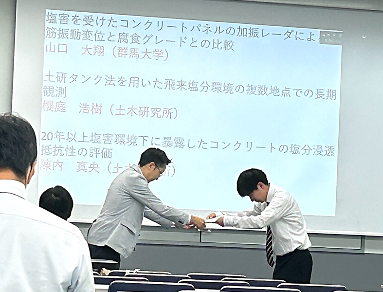 受賞題目は「塩害を受けたコンクリートパネルの加振レーダによる鉄筋振動変位と腐食グレードとの比較」であり、電子・機械部門三輪教授との共著です。三輪研で開発された加振レーダ技術は励磁コイルに強力な交流電流を印加して鉄筋コンクリート内の鉄筋を正弦加振しながら、ドップラレーダスキャン技術によりその鉄筋の振動変位分布を計測することにより、鉄筋に付着した黒錆位置や量を評価しようとする画期的な手法です。昨年度の受賞内容である高感度ソレノイド型のコイルを実構造物のコンクリートパネルに適用し、本システムの有効性を実証したことで受賞につながりました。
