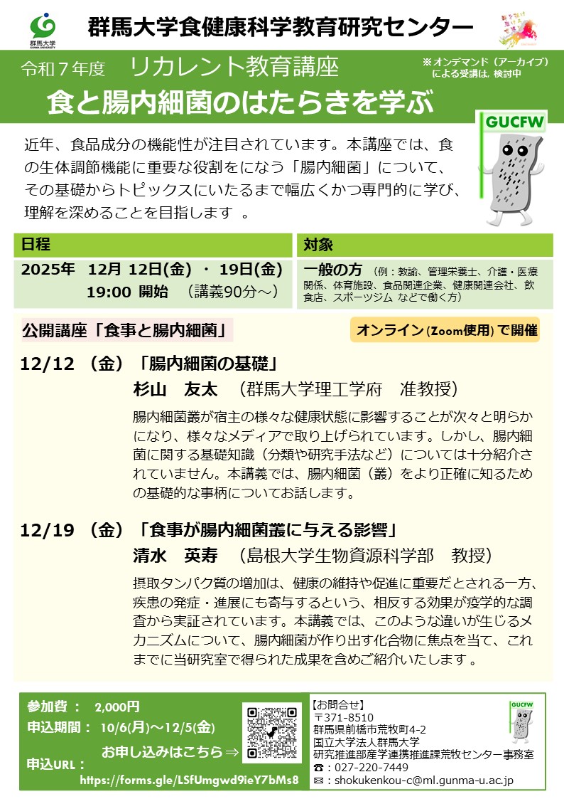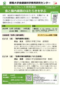 2025年12月12日(金)、19日(金)に令和7年度リカレント教育講座「食と腸内細菌のはたらきを学ぶ」を開講します。