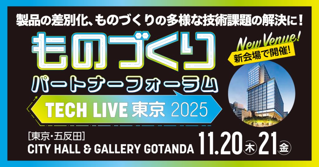 2025年11月20日(木)、21日(金)に東京・五反田で開催される、日経ものづくり主催 『ものづくりパートナーフォーラムTECH LIVE東京2025』に出展します。是非ご来場ください。