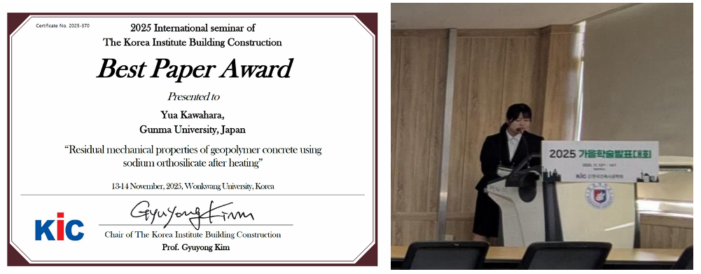 理工学府物質環境類 土木環境プログラム コンクリート工学研究室 M1 河原優有さんが韓国建築施工学会学術発表大会国際セッションにおいてBest Paper Awardを受賞しました。本学会は、2025年11月13日から二日間にわたり、韓国 Iksan市のWonkwang大学にて開催されました。発表内容は、建築施工におけるカーボンニュートラルに関係する内容であり、全体で65件の発表がありました。