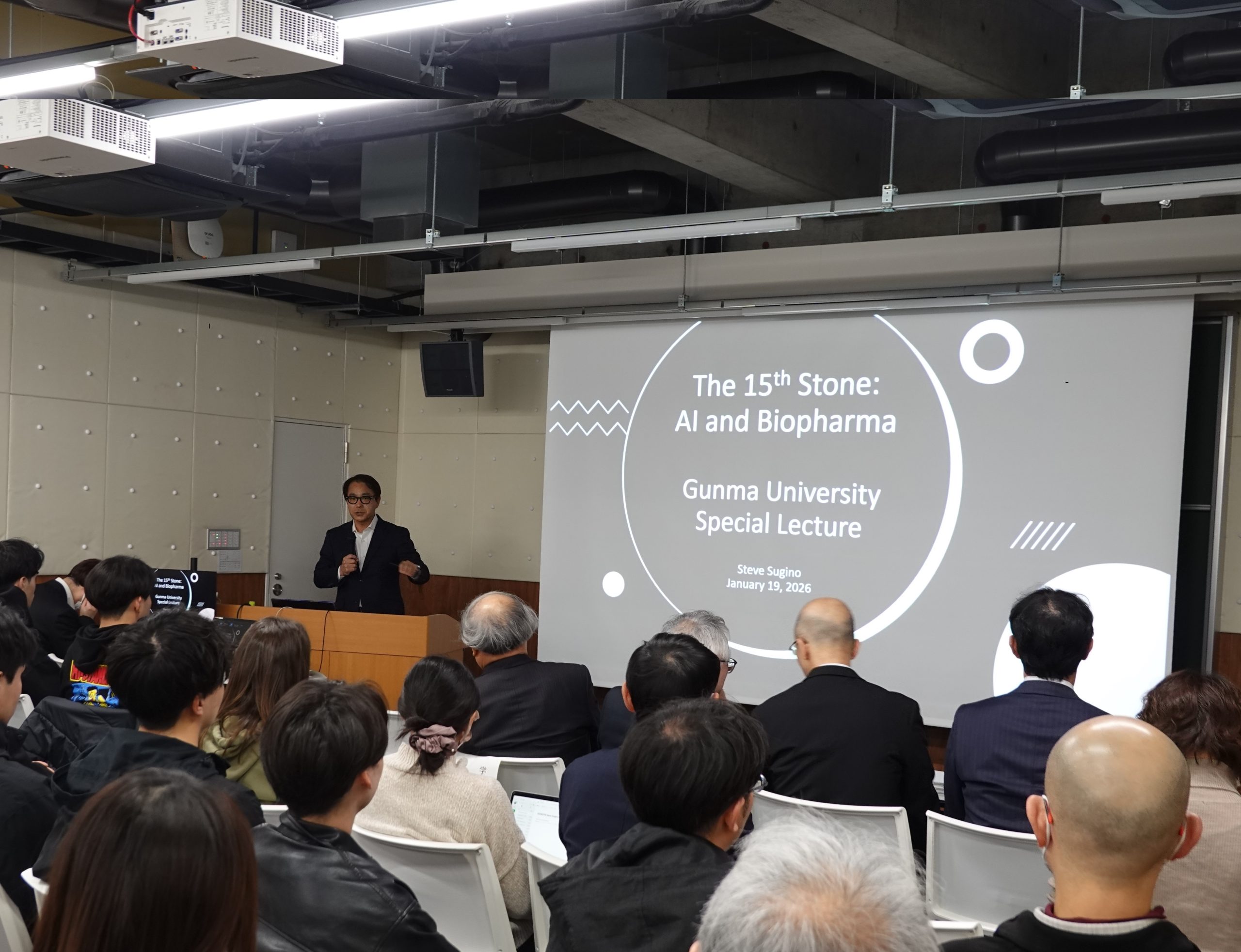 群馬大学大学院食健康科学研究科は、2026年1月19日(月)に「The 15th Stone: AI and Biopharma」と題した食健康科学研究科セミナーを開催しました。本セミナーには、ブリストル・マイヤーズ スクイブ株式会社のアジアパシフィック地域統括責任者であるSteve Sugino氏を講師としてお招きし、同大桐生キャンパス SUBARU Innovation Commons(6号館)にて、オンライン参加も可能なハイブリッド形式で行われました。