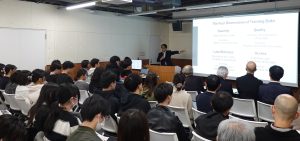 講演では、科学は真実を明らかにするという視点から始まり、私たち人間の資質と、AI能力を組み合わせることで得られる、バイオファーマなどの研究における驚くべき新たな可能性や変革的な成果について議論されました。本学の学生・教職員をはじめ、県内外の関係者約220名が参加し、熱心に耳を傾けました。