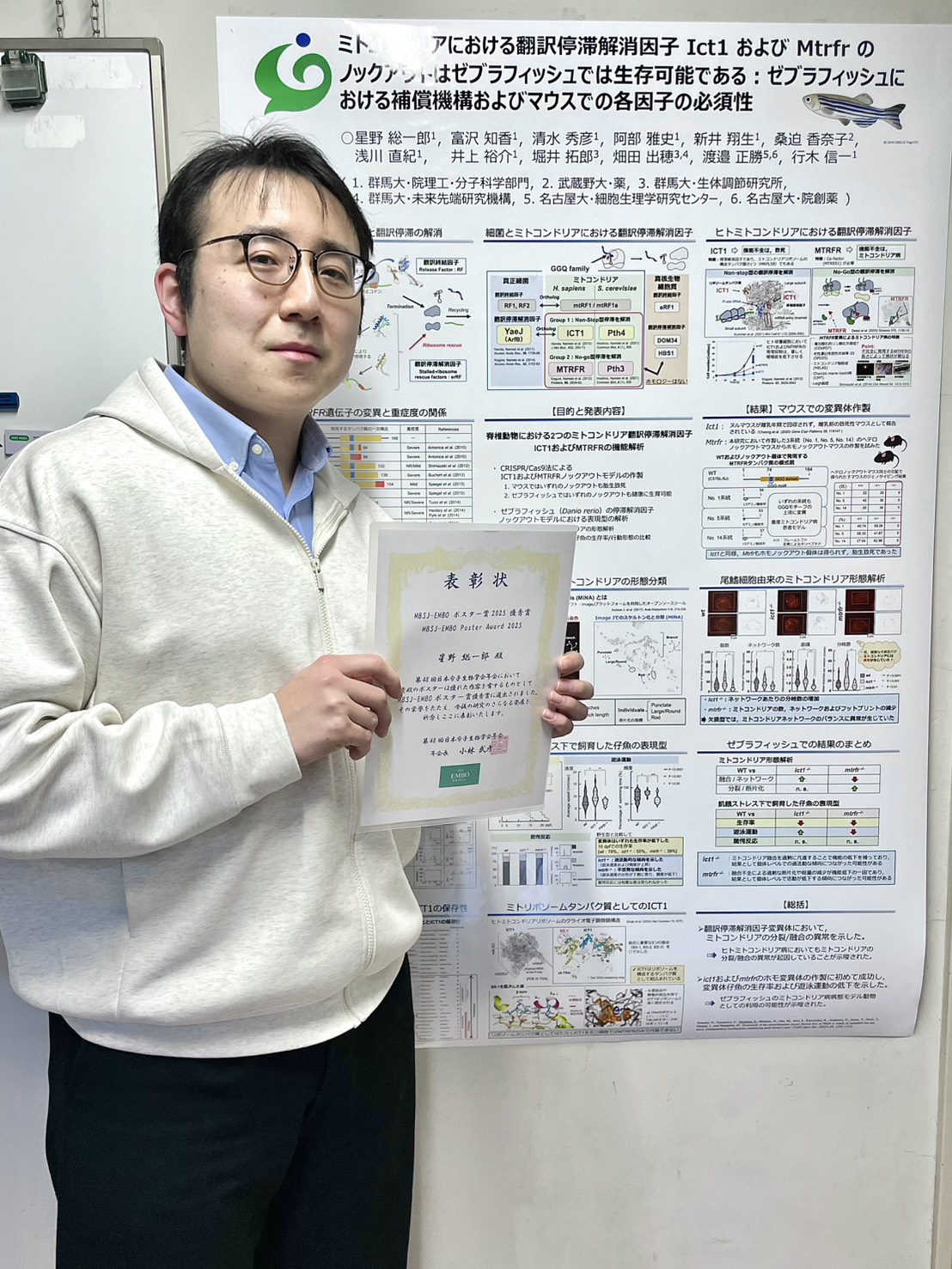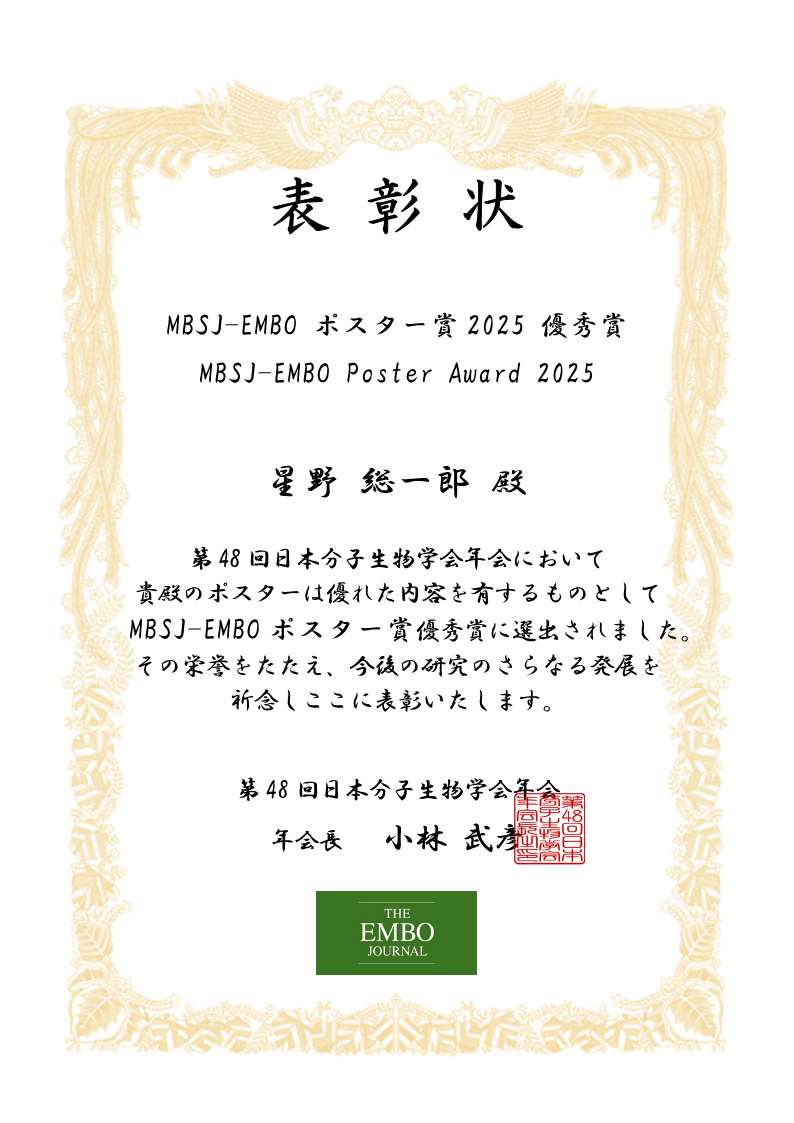 2025年12月3日~5日パシフィコ横浜で開催された第48回日本分子生物学会において、博士後期課程3年の星野総一郎さん(行木信一研究室所属)がMBSJ-EMBO Poster Award 2025を受賞しました。