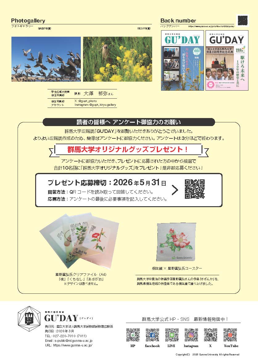 群馬大学広報誌「GU’DAY」の読者アンケートを実施しています。アンケートにご協力いただいた方には抽選で合計10名様に「群馬大学オリジナルグッズ」をプレゼントいたします。是非ご応募ください!
